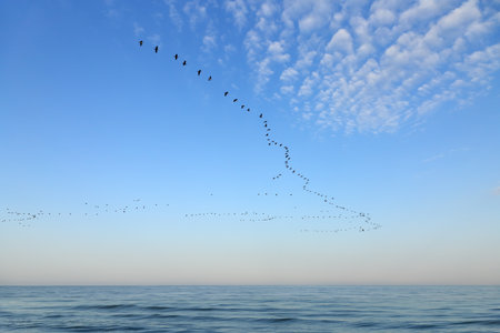 Seascape in the early morning and a flock of cormorants searching for prey above the sea.