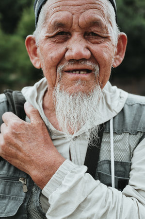 Closeup portrait of a senior asian man with a long white beard, displaying a look of wisdom and serenity
