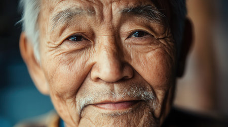 An elderly man representing various ethnicities displays warmth and tranquility while sitting in a softly lit indoor space, embodying wisdom and experience.