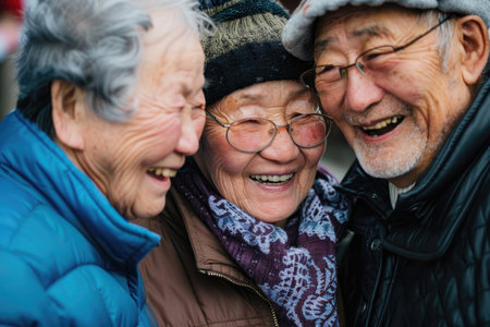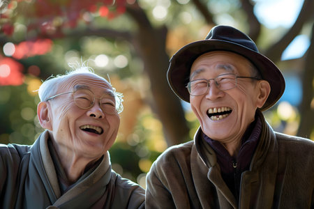 Elderly korean friends sharing a hearty laugh in a sunny autumn park