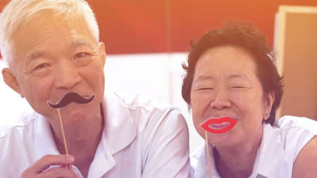 Happy playful Asian elderly senior couple together
