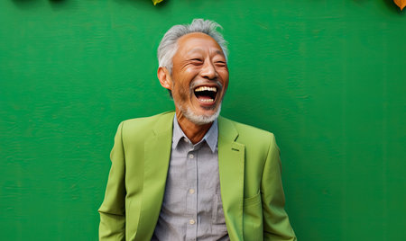 Joyful Asian man laughs heartily, his vibrant green attire blending with a lush backdrop. AI generative.