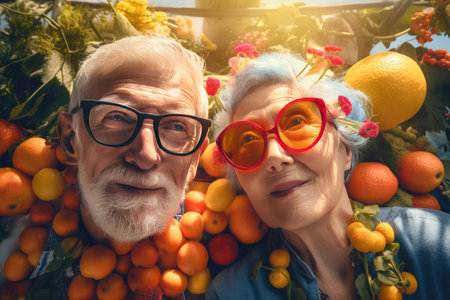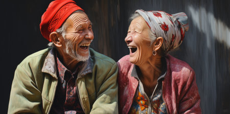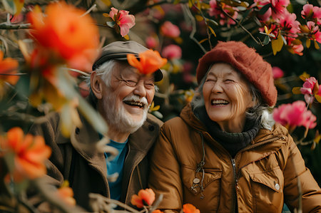 A heartwarming portrait of an elderly couple laughing together, surrounded by the vibrant blooms of a flower garden,AI generated