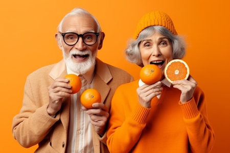 An elderly man with a wise expression stands against a striking gradient of fiery orange and mellow yellow. The highgloss background reflects the warm colors giving a sense of.