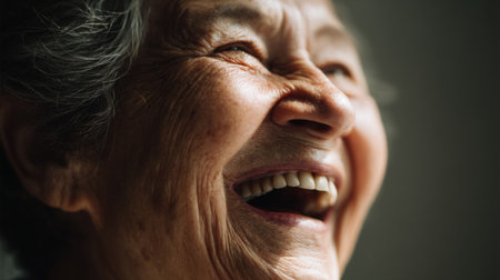A joyful elderly woman laughs heartily, showcasing the beauty of aging with grace. This portrait captures the essence of pure happiness, warmth, and emotional depth.