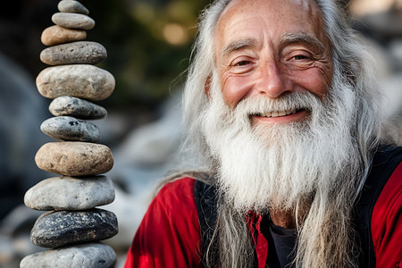 Portrait of an old man with long white beard and gray hair, dressed in a red T-shirt, standing next to a stack of stones on the beach.