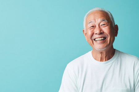 Portrait of a cheerful senior Asian man with a big smile, expressing happiness and positivity against a vibrant turquoise backdrop
