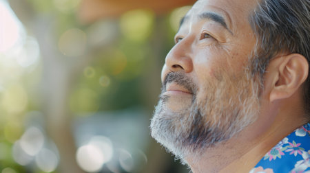An elderly Asian man wearing traditional attire gazes thoughtfully into the distance, capturing a moment of wisdom and cultural heritage in a serene outdoor setting.