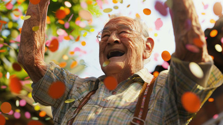 Elderly man laughing with joy, surrounded by colorful confetti in a festive outdoor celebration, embodying happiness in old age.