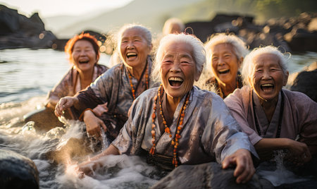 Group of older people relaxing and rejuvenating in a body of water.