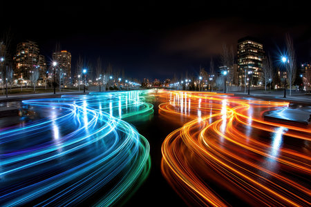 Captivating abstract image featuring vibrant light trails that create dynamic patterns and swirling colors, perfect for artistic projects and modern design elements.