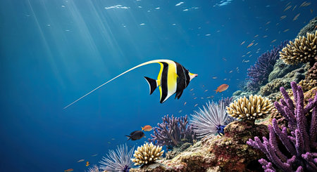 Moorish idol fish swimming on the bottom of ocean near coral reefs.