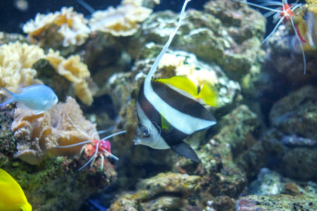 Pennant coralfish or Heniochus acuminatus swimming in aquarium.