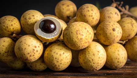 Realistic photo of a bunch of longans. top view fruit scenery