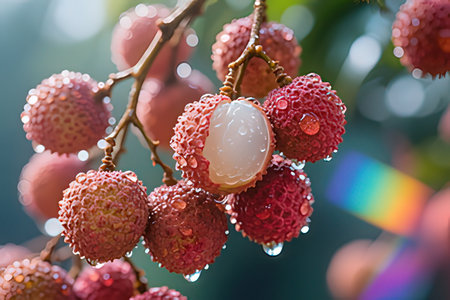 Ripe lychee fruit on a branch with water drops.