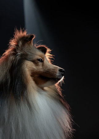 Captured in a graceful side profile against a deep black backdrop, a striking sable and white Shetland Sheepdog is dramatically illuminated by a warm light, accentuating its luxurious long coat and fluffy mane. Space for text, Selective focus.