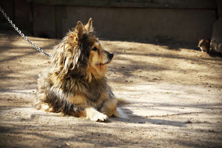 Cute stray dog relaxing on a sunny early spring morning waiting for food
