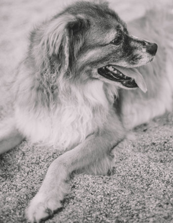 Portrait of a furry old dog on the sand of a beach