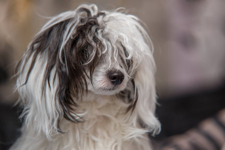 Shih-tzu dog lying on stone and looking aside. Strong wind.
