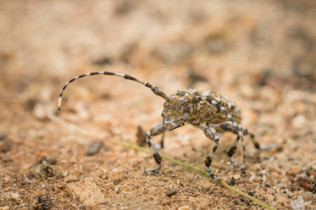 Extreme close-up of a longhorn beetle on sandy ground, with dust particles in the air. This detailed macro shot highlights the intricate features of this fascinating insect.