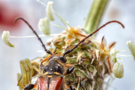 Closeup on a Spotted longhorn beetle, Leptura maculata on the pink flower, Daucus carota.