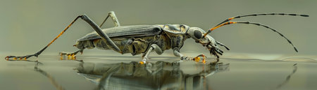 This captivating close-up reveals the mesmerizing beauty of a tiger longhorn beetle, perched gracefully on a reflective surface Its intricate body patterns and distinctive antennae, adorned with elegant rings, are rendered with breathtaking detail The natural setting adds a touch of authenticity, capturing the grandeur of this enigmatic creature in its native habitat AI Generative