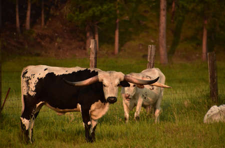 Pair of two longhorn cattles on a ranch in early morning hours.
