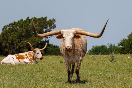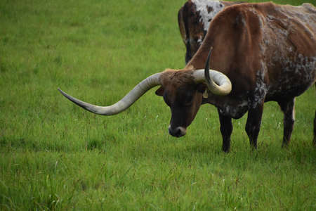 Close up of a longhorn bull on the grassland