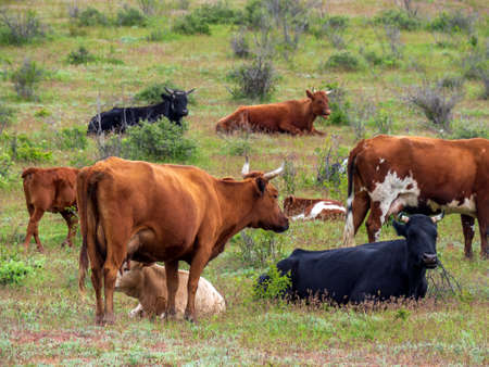 A herd of cattle on a free pasture is resting on a green meadow. Cows are lying or standing on the green grass. Farming, livestock.
