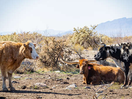 Longhorn bull relaxing in a barnyard in the hot summer sun in a rural environment