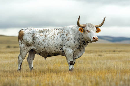 Photorealistic image of a large white barbary bull with spots in an open prairie field