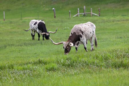 Two Texas Longhorn cows grazing in a field of green spring grass on a ranch with a fence in the distance.