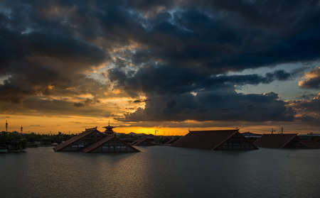 Landscape view of the town on the river during sunset
