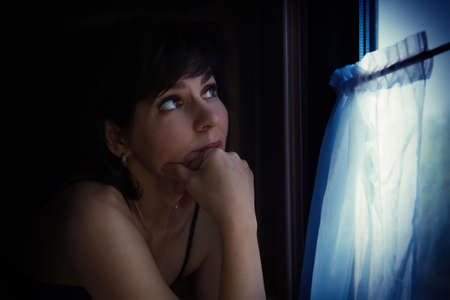 Portrait of a brunette woman looking at the moon at the window in her train compartment.