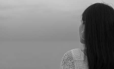 Pensive lonely young Asian woman. Back view of woman with sad feeling in black and white scene at the sea. Depressed and stressed girl stand and looking to grey sky and sea. Hopeless and despair.