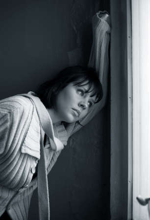 A woman stands by a window, looking out with a distant expression. Soft natural light streams through the window, casting shadows on her face.