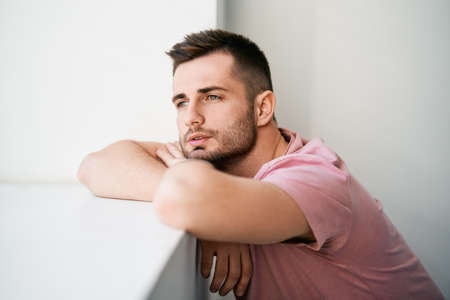 A guy looking out the window at sunset. Sad and upset guy in the apartment. Lifestyle image of a young man.