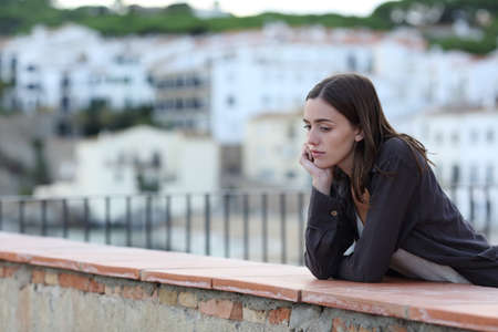 Sad woman complaining alone looking down in a balcony in a town on the beach
