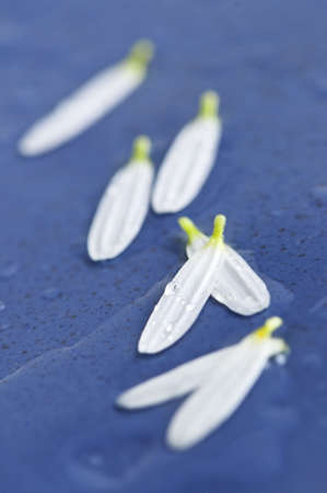 White lotus flower petals on blue background. Top view