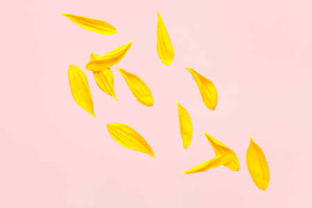 Flying sunflower petals on pink background