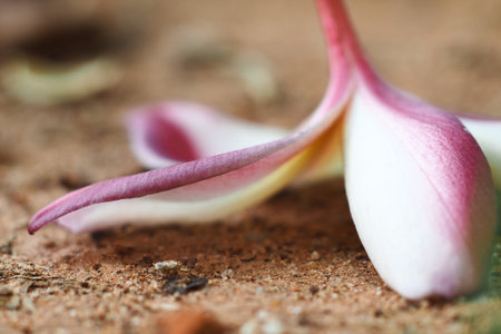 pink Plumeria spp on white and brown background, Common name is Frangipani , Pagoda tree, Temple tree , Family name is Apocynaceae