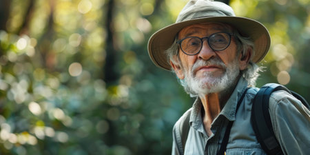 Elderly man with glasses and a hat, peacefully walking through a sunlit forest
