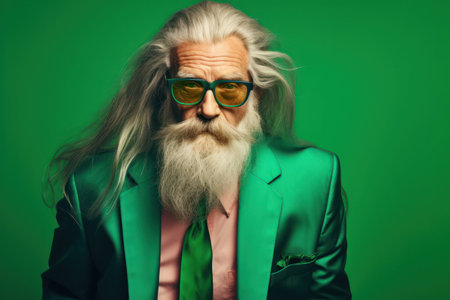 Portrait of a senior man with grey hair and beard laughing against a green background