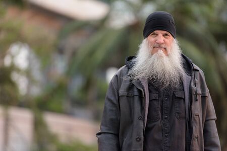 Portrait of a senior asian man with a long white beard and black hat, expressing wisdom and character
