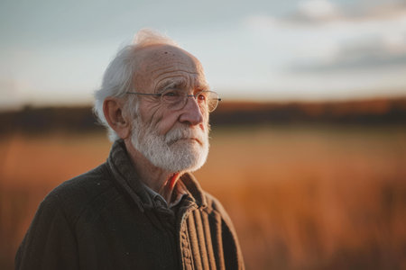 Elderly man with a thoughtful expression looking into the distance, with a warm sunset and blurred natural background.