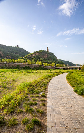 travel to China - view of Yi river and West Hill of Chinese Buddhist monument Longmen Grottoes (Dragon's Gate Grottoes, Longmen Caves) in spring season