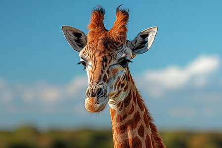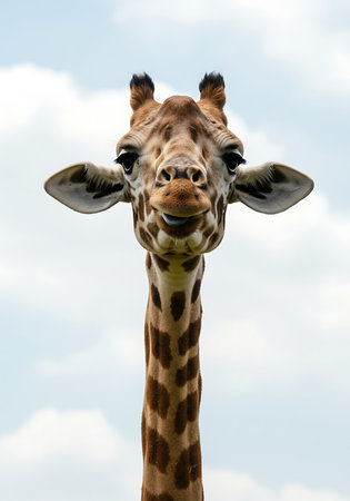 Giraffe portrait against a soft blue background, showcasing the intricate patterns of its fur and large expressive eyes, illustrating the beauty of wildlife in a serene setting