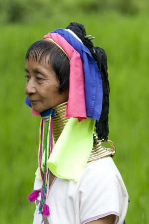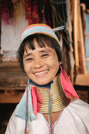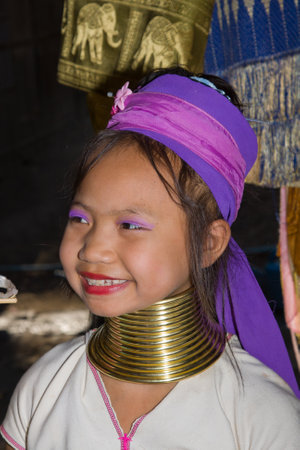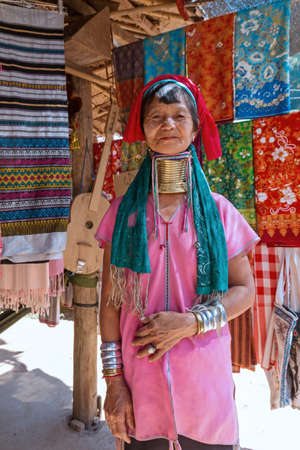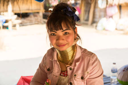 CHIANG RAI, THAILAND - JANUARY 2015: Unidentified Karen tribal woman near Mae Hong Son, Thailand, Chiang Rai. Padaung long neck hill tribe village, refugee community originate from neighboring Myanmar.