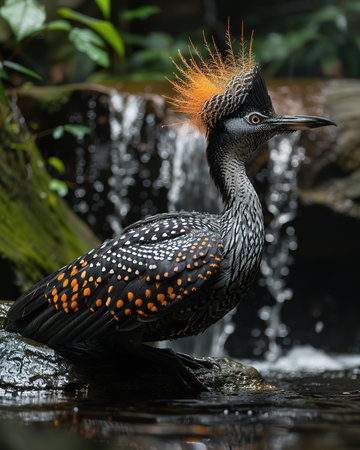A Horned Screamer Anhima cornuta standing at the edge of a water body surrounded by lush green vegetation, showcasing its distinctive black plumage, white markings, and unique horn-like structure on its head in its natural wetland habitat.