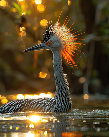 A duck stands prominently with a curious expression, surrounded by blurred greenery and soft light, creating a serene atmosphere in the late afternoon.